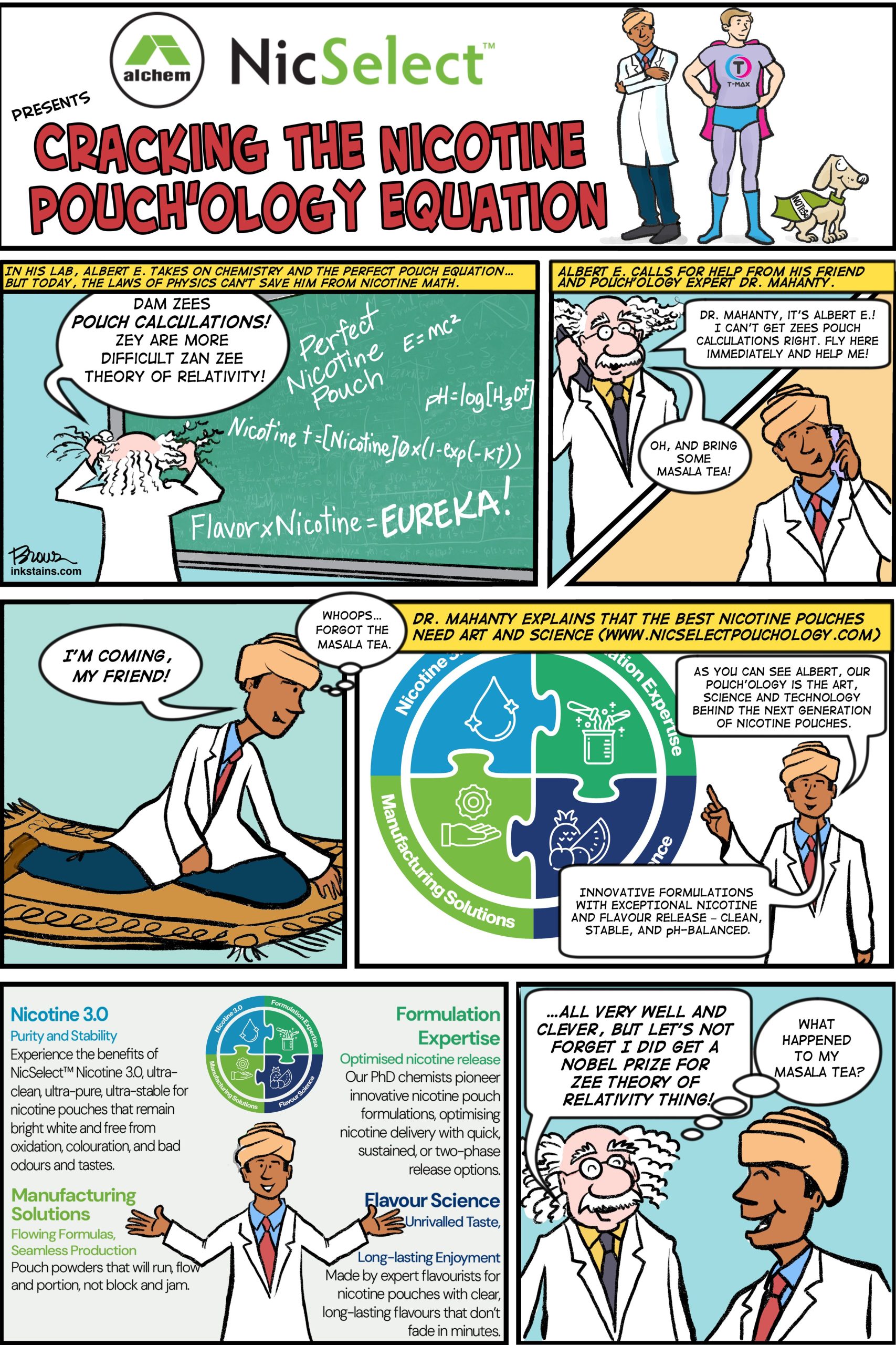 With the help of his curious friend, Albert E., he unlocks the secrets of Pouch’ology: creating pouches that are clean, white, stable, perfectly pH-balanced, and with optimised nicotine and flavour release.